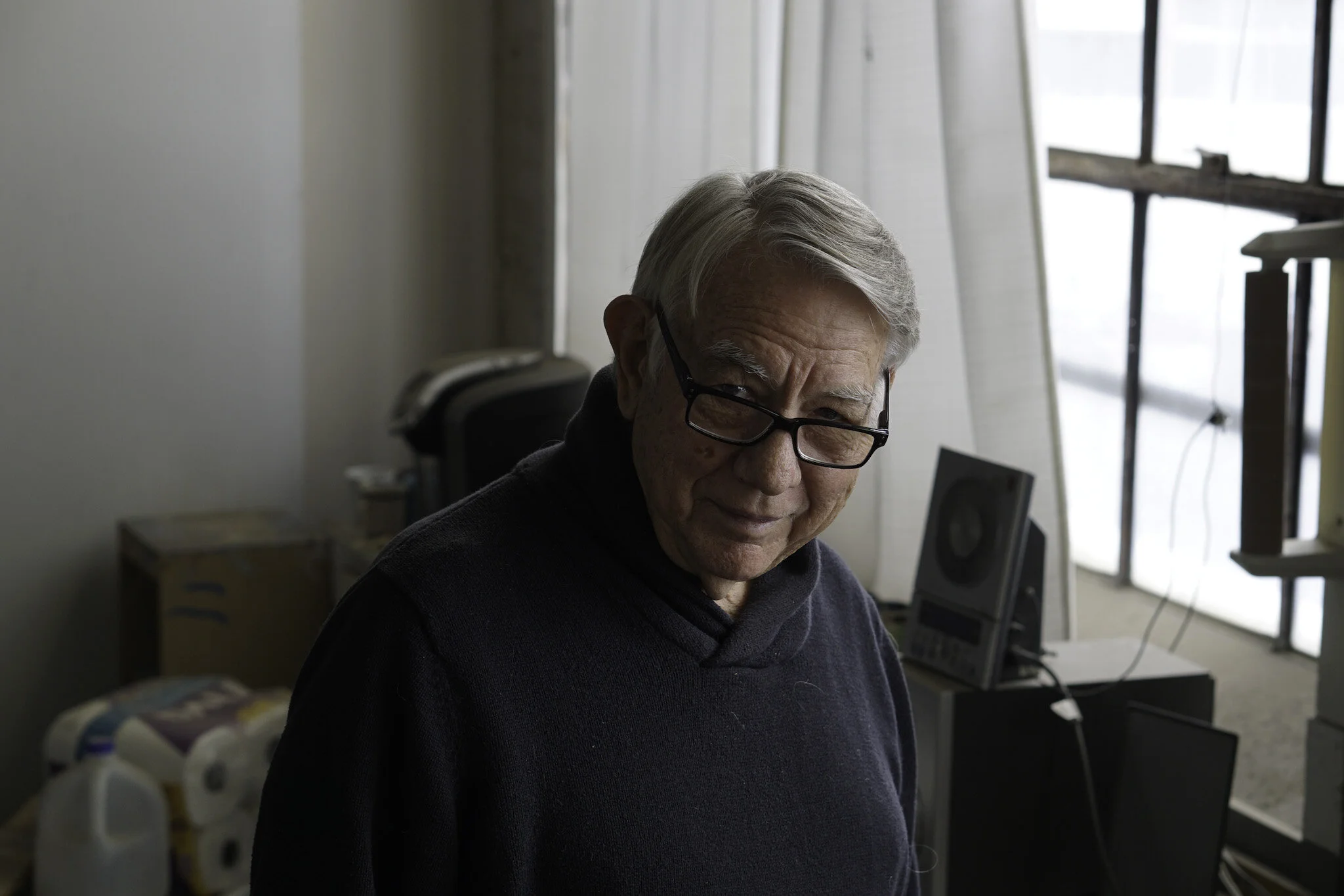 Clark’s studio was as big as the Domes he became known for building. At the time of this photoshoot, a few large pieces are out from the stack just leaning against a large north wall in this old industrial-looking space. Still, only a few even larger paintings are tucked away near a bank of East facing windows were most of the natural light pours in. He shares part of his studio with a former student, Ben Siekierski.