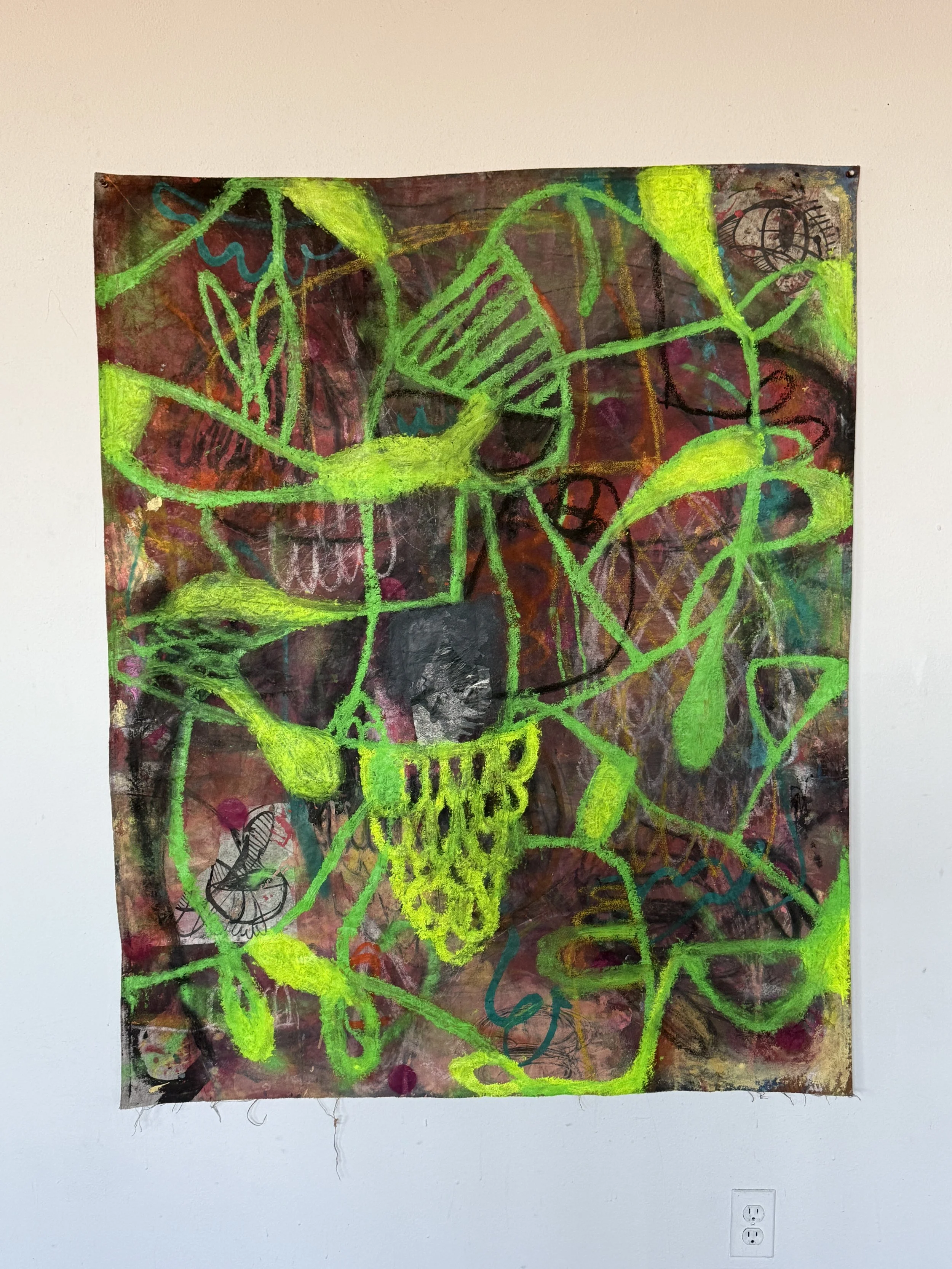 Medium: /// Collage, house paint, spray paint, oil paint-stick and charcoal on raw-canvas.